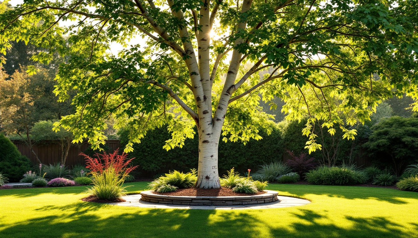 Hardscaping (stone, paths, seating) works beautifully under birch. The filtered light is perfect for a garden bench or a gravel seating area. A circular bench around the trunk, or a stone path snaking through the dappled shade, gives purpose to the space rather than leaving it as mowed turf. Many landscape designers feature birch tree designs in galleries, showcasing how white bark contrasts with slate, gravel, or dark perennials.